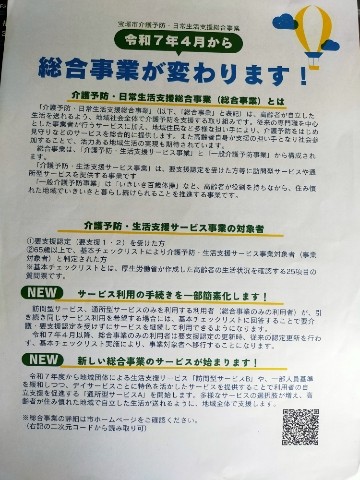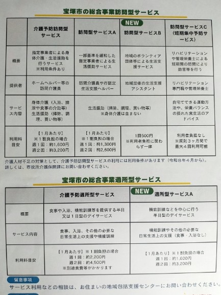 訪問型サービスA基準緩和へ届出 2025/09/04 こんにちは(^^♪ この度、令和7年4月から 宝塚市 総合事業が変わりっております(写真:市のパンフレットより) これに準じ、 訪問介護ZEROマインドは、令和7年9月1日 訪問型サービスA基準緩和へ届出 致しました。 令和7年11月 1日よりサービスA開始となります。 各居宅様、ご利用者様、ご家族様へはご説明を随時、担当ケアマネジャー様、ZEROマインド サービス提供責任者、及び管理者よりご説明させて頂きますね! ご理解の程、よろしくお願いいたします。
